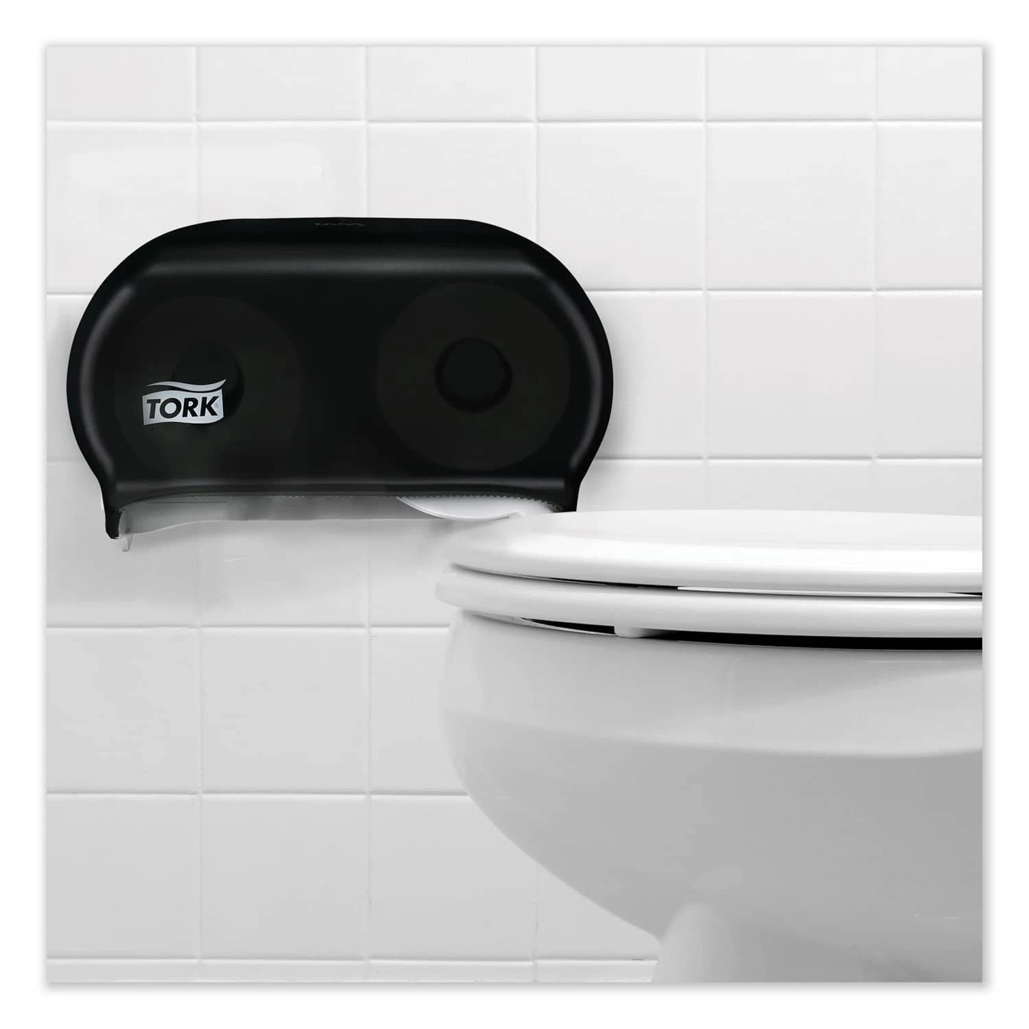 The Tork Twin Standard Roll Bath Tissue Dispenser is the ideal solution for any high traffic restroom environment. This dispenser solution helps to reduce maintenance costs by decreasing the frequency that the dispenser needs to be refilled and fewer service interruptions to be experienced by your restroom users. The clean, modern appearance compliments any environment and any decor. The translucent front cover allows for “at a glance” inspection to know when toilet paper refills are needed. Smooth cover is easy to clean and maintain. Built-in pilferage control with the ability to lock this dispenser, key included. High impact plastic design is durable and helps prevent breakage. For Roll Size: Up to 5.5″ Diameter; Roll Type: Conventional Bath Tissue; Capacity (text): Holds Two Rolls; Color(s): Smoke.